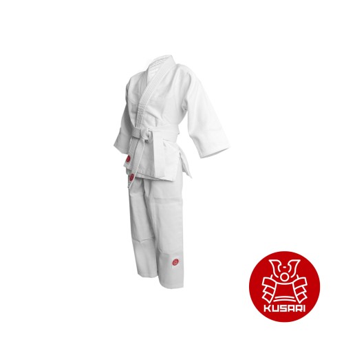Posiada dodatkowe wzmocnienia w kołnierzu, na kolanach. W pasie wszyta guma plus dodatkowo sznurek do regulacji. W komplecie oczywiście pas - biały. Idealnie nadaje się do codziennego treningu jak i walk na zawodach.