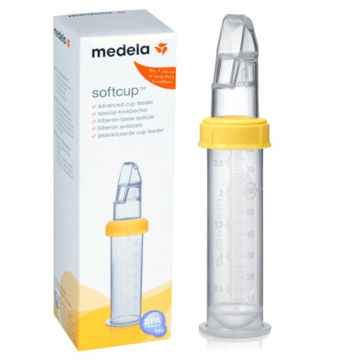 Zestaw Medela SoftCup pozwala w prosty sposób karmić niemowlę łyżeczką. Znajdująca się między zbiornikiem i końcówką membrana z zaworem jednokierunkowym pozwala łatwo regulować przepływ mleka poprzez naciśnięcie ścianek końcówki.