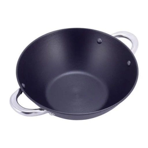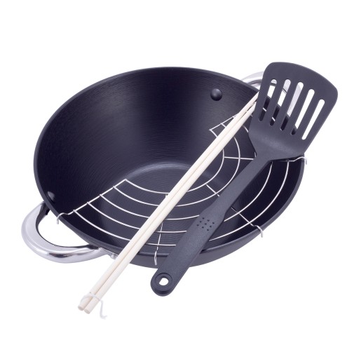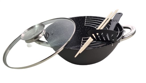 Wykonana z jednego odlewu żeliwa z powłoką marmurową nieprzywierającą, uchwyty - ze stali nierdzewnej. W zestawie są szklana pokrywa, łopatka z otworami oraz chińskie pałeczki. Pojemność: 3.6L. Średnica: 28cm. Wysokość: 9.5cm. Zalecane mycie ręczne.