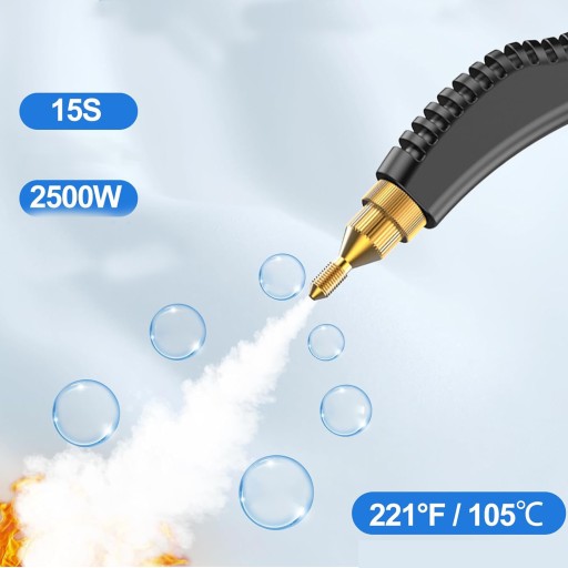 - Ta wysokotemperaturowa przenośna maszyna parowa o mocy 2500 W może wytworzyć parę o wysokiej temperaturze 105°C w około 10 sekund, tworząc dużą prędkość i moc czyszczenia, aby szybko rozpuścić plamy.