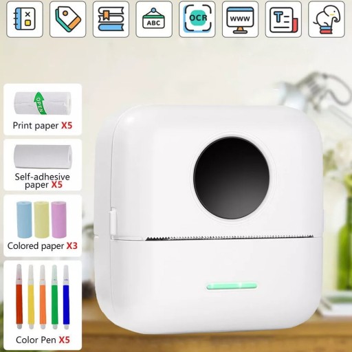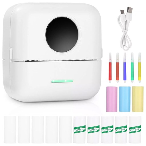 - Pakiet zawiera: 1X Drukarka, 5 X Rolki papierowe, 5 X Rolki naklejek, 3 X Rolki papierowe kolorowego, 5 X Kolorowe długopisy, 1X Kabel ładujący USB 1x Instrukcja obsługi (angielski)