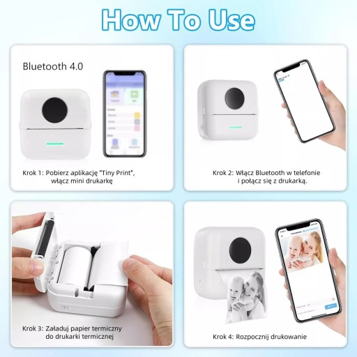 Uwaga: Postępowanie z obsługą drukarki, aby wyszukać „Tiny Print” w App Store lub Google, aby połączyć się z urządzeniem.