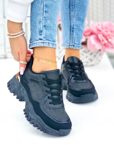 Modne, czarne adidasy ze skóry ekologicznej. Buty posiadają grubą podeszwę oraz subtelne, połyskujące wstawki.