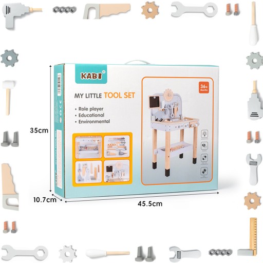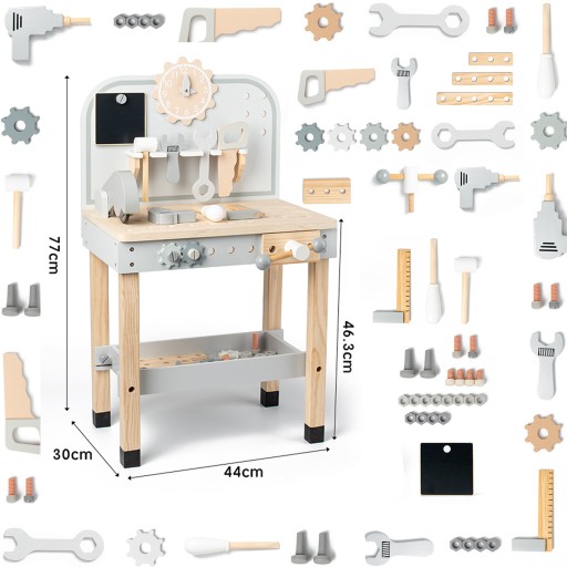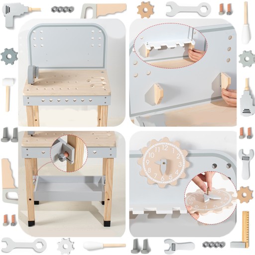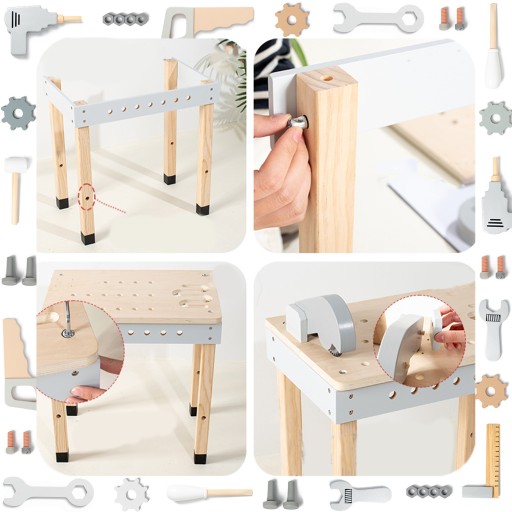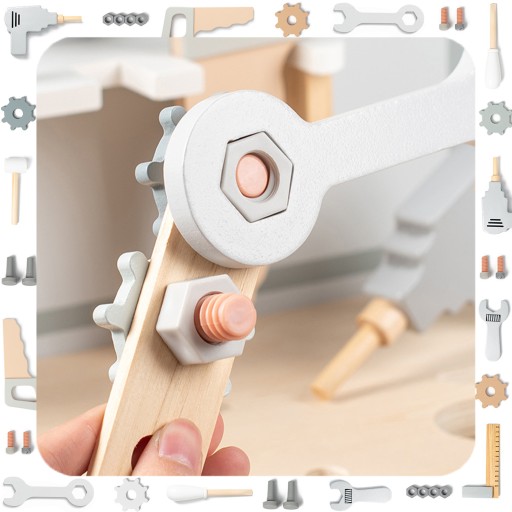 - Realistyczna zabawa: Stół wyposażony jest w różnorodne narzędzia, takie jak młotek, śrubokręty, klucz, piła i wiele innych, które pozwolą dziecku naśladować pracę prawdziwego majsterkowicza.