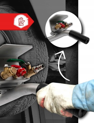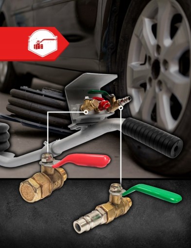 Podnośnik został wyposażony w zawory kulowe 3/8”, które są łatwe w obsłudze dzięki kolorowym oznaczeniom – zielona dźwignia do zasilania, czerwona do spuszczania powietrza. To ułatwia szybką i intuicyjną obsługę urządzenia.