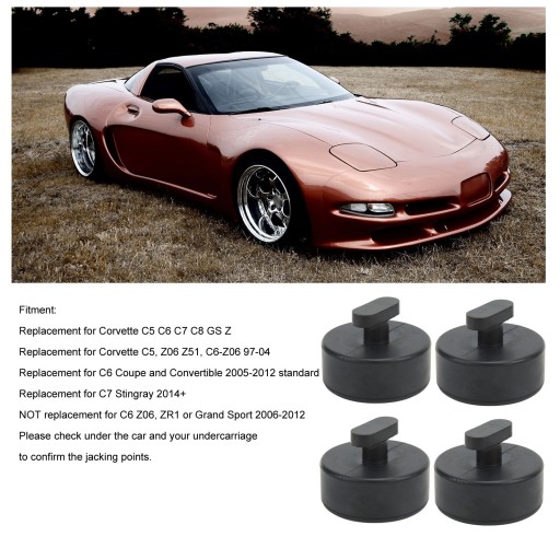 Item Type: Jack Pad Material: Rubber Fitment: Replacement for Corvette C5 C6 C7 C8 GS Z Replacement for Corvette C5, Z06 Z51, C6-Z06 97-04 Replacement for C6 Coupe and Convertible 2005-2012 standard Replacement for C7 Stingray 2014+ NOT replacement for C6 Z06, ZR1 or Grand Sport 2006-2012 Please check under the car and your undercarriage to confirm the jacking points.