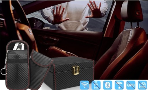 Luksusowe pudełko Faradaya, wykonane z trwałej skóry PU o strukturze włókna węglowego. Z metalową klamrą zapewniającą dodatkowe bezpieczeństwo, nasze pudełko wraz z dwoma etui łączy w sobie styl i ochronę.
