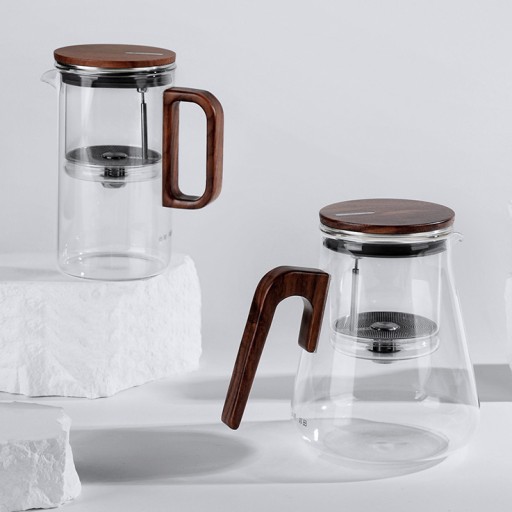 Pokrywa kubka i uchwyt są wykonane z czarnego drewna orzechowego, a styl łączy naturalne i nowoczesne szkło, czyniąc go wysokim estetycznym wzornictwem.