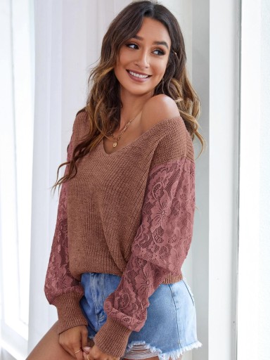 TR11213 SHEIN СВИТЕР С V-образным вырезом, КРУЖЕВО С ДЛИННЫМ РУКАВОМ DIRTY PINK S