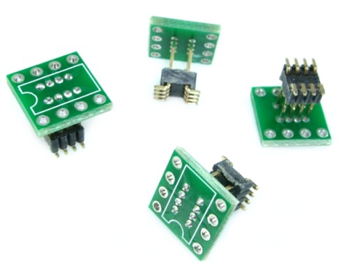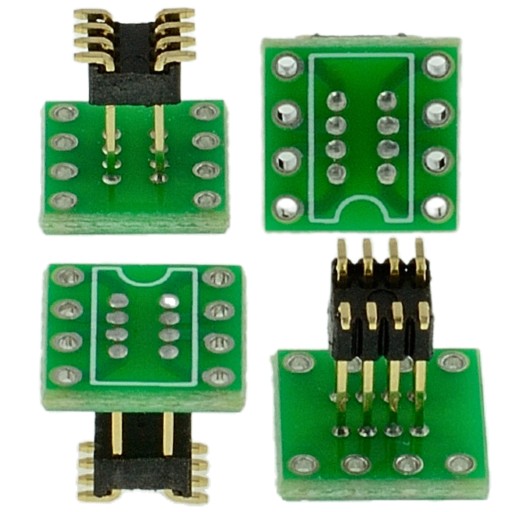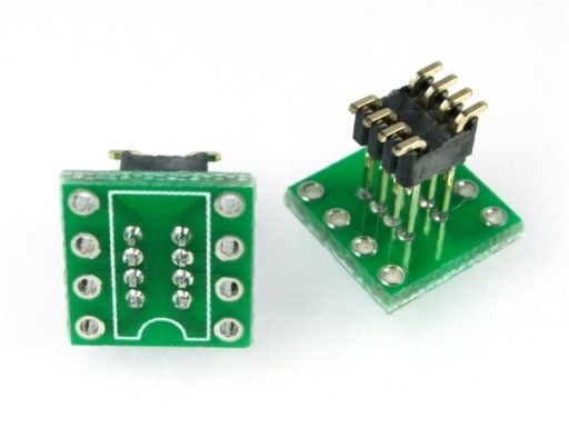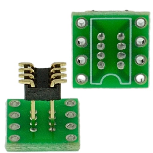 Przejściówka umożliwiająca użycie układu scalonego w obudowie DIP8 w miejsce układu scalonego w obudowie SOIC8 (SO8, SOP8) raster 1,27mm.