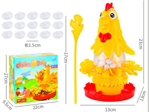 Zasady gry są proste, ale pełne napięcia! Aby rozpocząć, złóż zestaw, instalując gniazdo na solidnej podstawie, a następnie przymocuj przeźroczysty tułów kurczaka. Zakręć mu głową i umieść jajka w jego wnętrzu. Następnie wciśnij pióra w odpowiednie otwory i przygotuj się do rozpoczęcia zabawy!