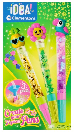 Oryginalny zestaw kreatywny, służący do złożenia 3 długopisów i ich spersonalizowania przy pomocy różnych ozdób w stylu tropikalnym.