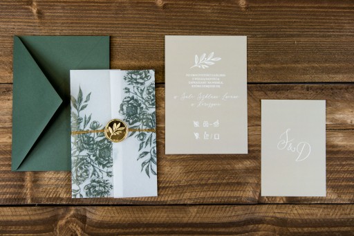 Delikatna, półprzeźroczysta kalka o dużej gramaturze, otula karty, tworząc niesamowity efekt mgiełki, z roślinnym nadrukiem, który idealnie łączy się kolorystycznie z kolorem koperty i kart zaproszenia.