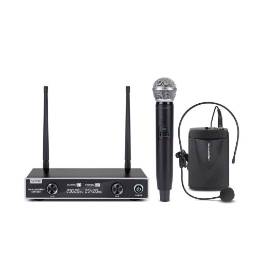- Dwa nadajniki mikrofonu bezprzewodowego: Mikrofon doręczny, Mikrofon nagłowny + Nadajnik bodypack (w zestawie 1 mikrofon nagłowny + 1 mikrofon krawatowy)