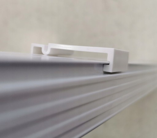 Klip mocujący dodawany w zestawie umożliwia łatwy montaż do sufitu. Należy pamiętać, że lamele są krótsze od całkowitej wysokości żaluzji o 4,5cm - taka jest łączna wysokość szyny z elementami prowadzącymi oraz klipu montażowego.