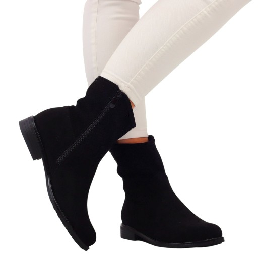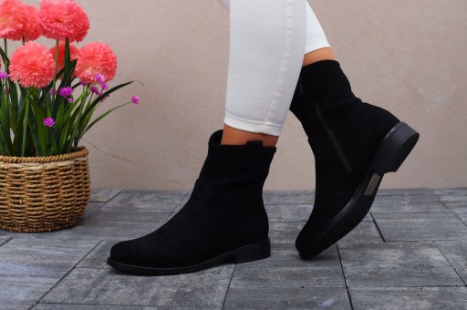 Eleganckie botki damskie z zamszu na słupku w kolorze czarnym. Łatwe w zakładaniu- zapinane na suwak. Wykonane z dobrych jakościowo materiałów. Idealne na wiosnę lub jesień Szeroki obcas zapewnia stabilność oraz komfort użytkowania. Modny fason stanie się uzupełnieniem niejednej stylizacji, a stylowe wycięcie doda im szyku.