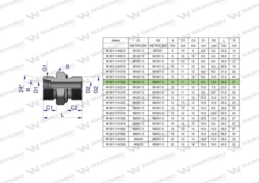 Przyłączka hydrauliczna metryczna BB (XGE) M16x1.5 10L x M22x1.5 ED Waryńsk