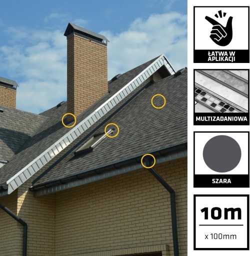 Sika MultiSeal szara 10cm to samoprzylepna, taśma uszczelniająca z bitumu modyfikowanego kauczukiem z jednej strony wzmocniona folią aluminiową. Zastosowanie Uszczelnienie przed wnikaniem wody i przeciekom w: dachach (również krytych blachą), zarysowanych elementach budowli, papach bitumicznych i innego rodzaju pokryciach dachowych. Taśma Sika MultiSeal jest bardzo łatwa w użyciu i jest ekonomiczną metodą uszczelniania. Posiada bardzo dobrą przyczepność do wielu podłoży. Odporność na obciążenia atmosferyczne, na promieniowanie UV i bitumy. Może być pokryta powłokami malarskimi i być układana w niskich temperaturach.