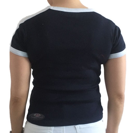 - Okrągły dekolt z lamówką wykonaną z tego samego materiału, co reszta koszulki