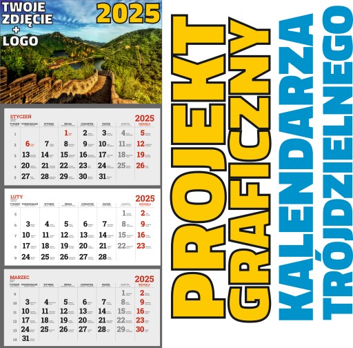 Wśród naszych innych ofert możesz dokonać zakupu usługi wykonania projektu kalendarza trójdzielnego. Taki projekt będzie można wykorzystać przy druku kalendarzy zakupionych na niniejszej ofercie. Naszych klientów obsługujemy kompleksowo - od projektu po druk.