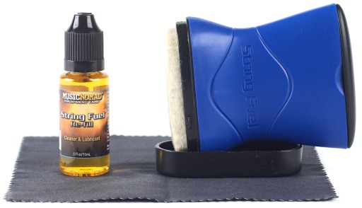 Music Nomad Premium, to trzyczęściowy zestaw do pielęgnacji strun, zawiera jeden z naszych najpopularniejszych produktów do pielęgnacji wszystkich typów strun, które można znaleźć na gitarze, basie, banjo, ukulele, mandolinie itp. Po prostu napełnij nasz ergonomiczny, specjalnie zaprojektowany aplikator, który nie pobrudzi ci instrumentu, dzięki temu szybko i łatwo zadbasz o swoje struny. Nasz aplikator pasuje do wszystkich twoich strun. Nacisk na przycisk powoduje uwolnienie roztworu, następnie możesz oczyścić i za pomocą jednego, łatwego przeciągnięcia posmarować struny. Dzięki temu twoje struny wytrzymają dłużej, zmniejszą szelest podczas poruszania palcami i zwiększą prędkość, z jaką można po nich przesuwać palce. String Fuel to hybrydowa mieszanka naturalnie występujących olejów, pozbawionych silikonu, które są zmieszane z olejami mineralnymi najwyższej jakości, tak aby dostarczyć klientowi jak najlepszy środek do czyszczenia i smarowania strun, jaki jest dostępny na rynku. Napełnij suchą poduszeczkę aplikatora mniej więcej połową butelki, podczas ponownego użytkowania, potrzeba mniej płynu niż za pierwszym razem. W zestawie została umieszczona miękka ściereczka z mikrofibry, która idealnie mieści się w dłoni.