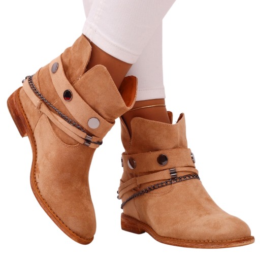 Damskie, wsuwane botki na obcasie w kolorze beżowym z ozdobnymi łańcuszkami i paseczkami. Posiadają ukryty koturn oraz delikatne ocieplenie. Stabilna, gruba podeszwa dobrze amortyzuje stopę oraz chroni przed zimnem.❄ Wykonane z dobrych jakościowo materiałów. Prosty fason sprawia, że pasują do wielu stylizacji.