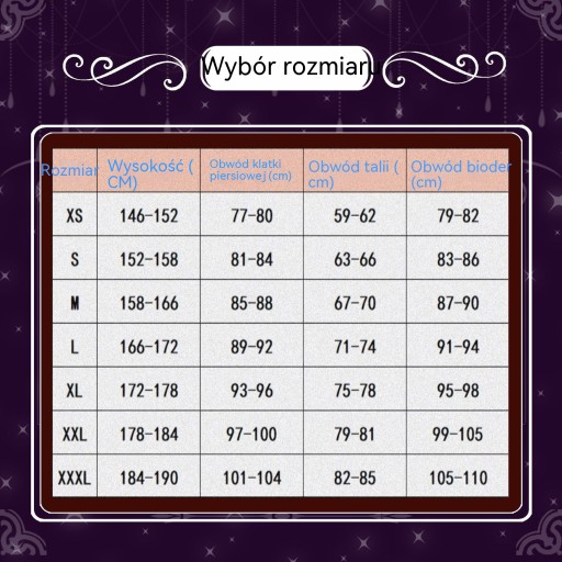 Przed zakupem prosimy o wybranie rozmiaru zgodnie z poniższą tabelą rozmiarów.