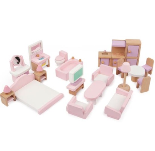 Wspaniały drewniany zestaw mebelków dzięki, któremu twoje dziecko będzie mogło urządzić domek swoich lalek tak jak chcę