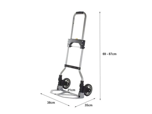 Wózek transportowy, składany to narzędzie idealne do pomocy w warsztacie, magazynie jak również w gospodarstwie domowym, do przewożenia ciężkich rzeczy. Wózek wyposażony jest w teleskopową, regulowaną rączkę, można go więc dostosować do wzrostu osoby, tak żeby prowadzenie było wygodne oraz nie wpływało źle na kręgosłup.