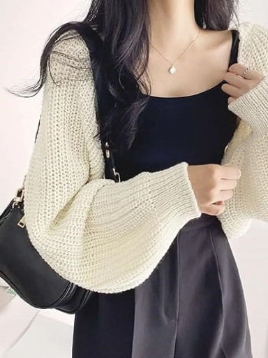 Укороченный однотонный вязаный свитер с открытым передом и длинным рукавом