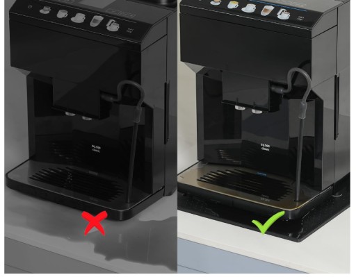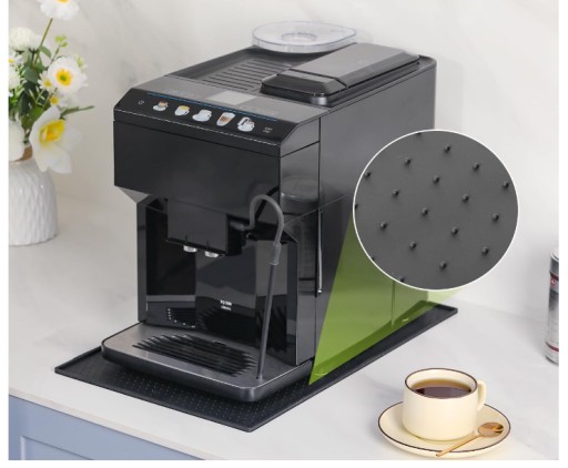 - Silikonowa mata pod ekspres do kawy ma podniesioną krawędź, aby zapobiec zanieczyszczeniu powierzchni roboczej rozlaną kawą.