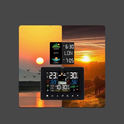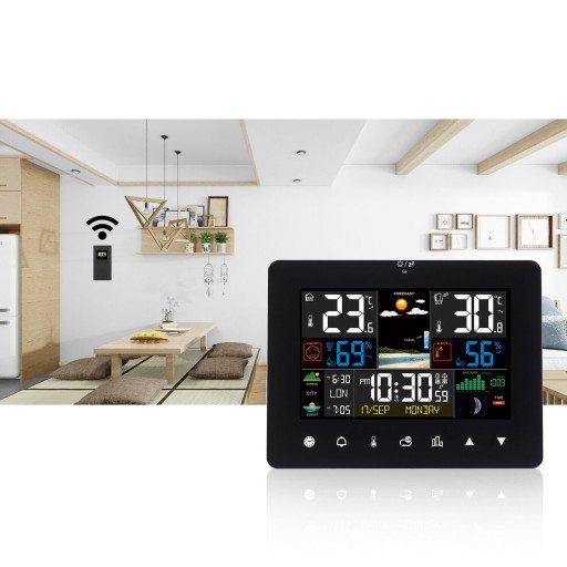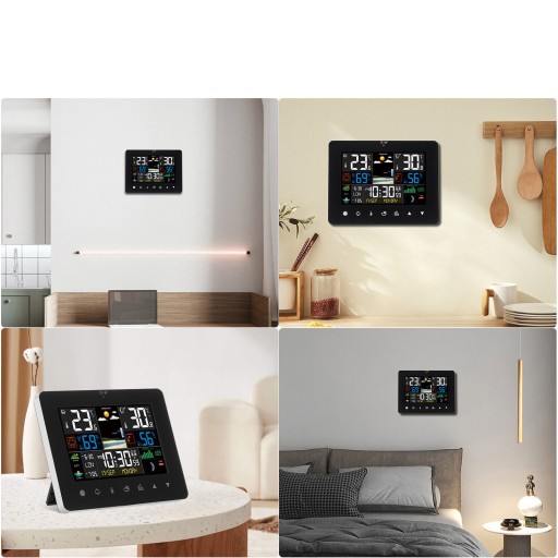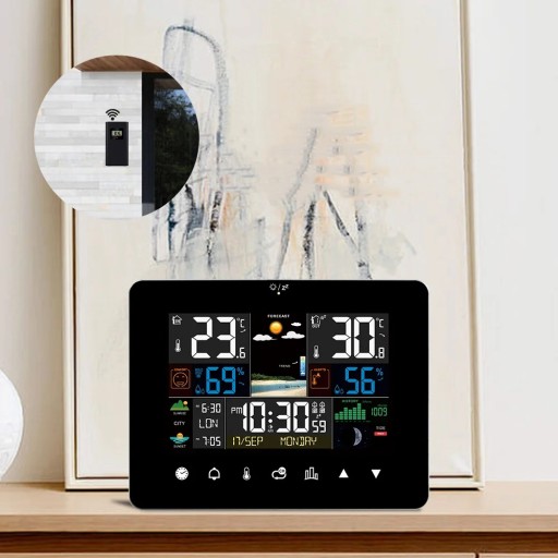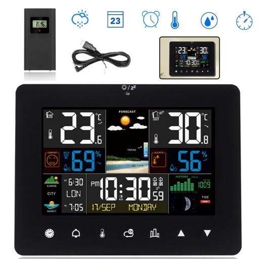 🌥️Bezprzewodowa cyfrowa stacja pogodowa z czujnikiem odpornym na warunki atmosferyczne: Wyświetla temperaturę wewnętrzną i zewnętrzną, kalendarz, fazę księżyca, godzinę, dzień tygodnia, datę, wilgotność wewnętrzną i zewnętrzną, ciśnienie powietrza zewnętrznego i inne.