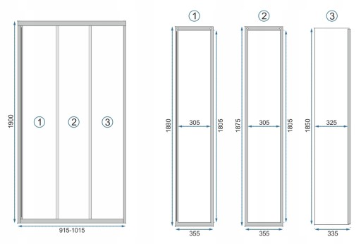 - Drzwi: w ramie, 3-elementowe, jeden element stały, dwa elementy przesuwne /góra rolki jezdne, dół suwaki/