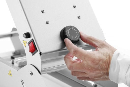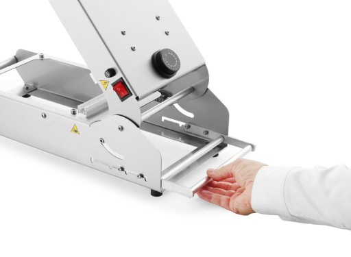 • Automatyczna gilotyna: Wysuwana gilotyna z bezpiecznym nożem w osłonie (technologia air-cut) - precyzyjne cięcie folii tuż za zgrzewanym pojemnikiem.