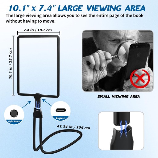 - 5 x bardzo duży i wyraźny obszar widzenia: duże szkło powiększające ma obszar widzenia 25 x 18 cm. Większy rozmiar i lepszy efekt wizualny niż istniejące na rynku lupy na szyję. Możesz zobaczyć większy obszar bez wielokrotnego przesuwania szkła powiększającego. Można go powiększyć o 500% bez zniekształceń.