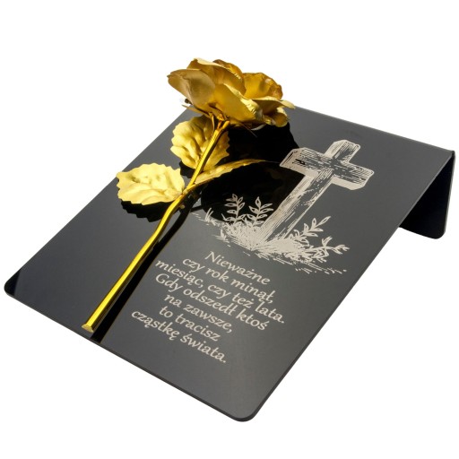 Postument został wykonany ze szkła akrylowego, ozdobiony metaliczną wieczną różą.