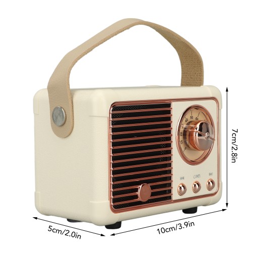 Cecha: 1. Przenośny projekt retro: Retro głośnik Bluetooth zajmuje tylko około 10x7x5 cm/3,9x2,8x2,0 cala, jest super ładny, idealny do pokoju, łatwy do przenoszenia i łatwy do słuchania muzyki. Świetne do gotowania, przyjęć, prac w ogrodzie, garażu, ogniska, pieszych wędrówek, jazdy na rowerze lub słuchania muzyki vintage na plaży, idealne do wystroju domu.