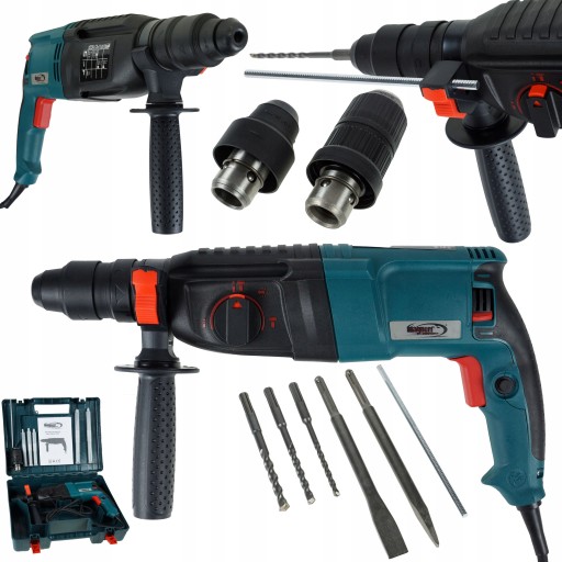 Młotowiertarka z powodzeniem nada się do wiercenia otworów w betonie, kamieniu i innych materiałach w pozycji poziomej, jak i pionowej. Urządzenie sprawdzi się także przy kuciu, wierceniu, wyburzaniu elementów budowlanych, rowkowaniu, wierceniu pod kołki montażowe i wielu innych robotach budowlanych i remontowych. W młotowiertarce zastosowano dodatkowy uchwyt z możliwością regulacji w zakresie 360°, dzięki czemu praca jest wygodna i precyzyjna. Całość wraz z dodatkowym osprzętem zapakowana została w walizkę z tworzywa sztucznego z organizerem.