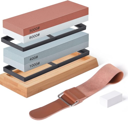 - W zestawie: dwa kamienie z korundu z podkładkami antypoślizgowymi, skórzany pasek, kamień naprawczy, bambusowa podstawka oraz skórzany pasek do gratowania i honowania ostrza
