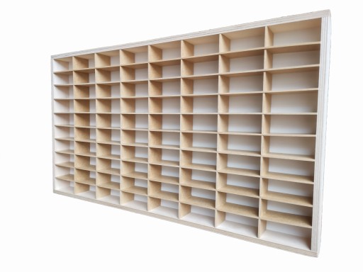 Rama półki wykonana jest z certyfikowanej sklejki o grubości 10 mm. Przegrody wykonane są z płyty meblowej o grubości 3 mm. Można swobodnie dostosować rozmiar półki usuwając lub dodając przegrody. Tylna część półki zabudowana płytą meblową o grubości 3 mm. Dzięki temu autka prezentowane będą na białym tle.