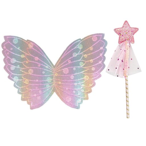 Opalizujące, kolorowe skrzydełka dla dziecka, w komplecie z różdżką. Skrzydełka posiadają elastyczne gumki umożliwiające komfortowe założenie oraz noszenie skrzydełek. Skrzydełka efektownie się mienią i doskonale komponują z błyszczącą różdżką. Różdżka zakończona została brokatową gwiazdką, od której ku dołowi odchodzą elementy dekoracyjne. Zestaw doskonale pasuje do przebrań wróżki czy magicznego jednorożca. Doskonały na sesje zdjęciowe, zabawy, bale przebierańców. Wymiary skrzydełek: 35x20 cm.