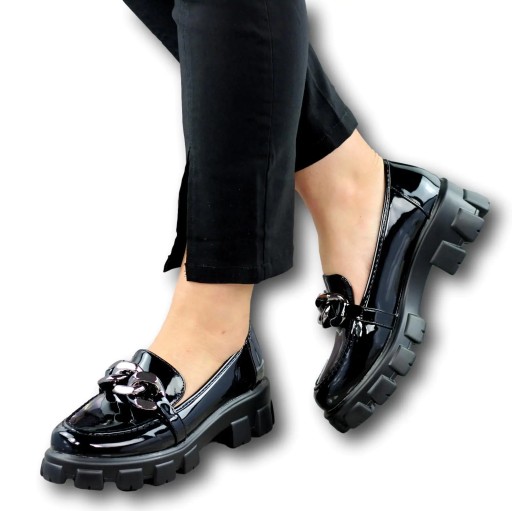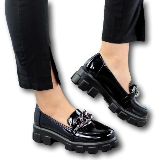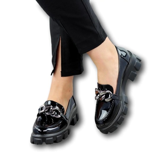 CZARNE LAKIEROWANE PÓŁBUTY MOKASYNY GRUBA PODESZWA ŁAŃCUCH