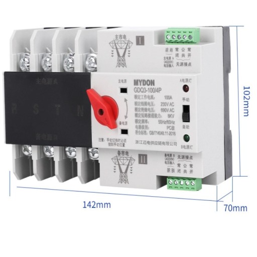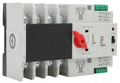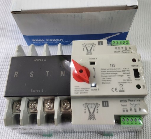 NOWE, nieużywane, automatyczne przełączniki zasilania ATS 125A 4P do zmiany sposobu zasilania w przypadku awarii. 3 fazowe N. Z sieci na fotowoltaikę i odwrotnie, z sieci na agregat prądotwórczy i odwrotnie, z sieci na inną sieć i odwrotnie. Możliwość ręcznej zmiany zasilania.