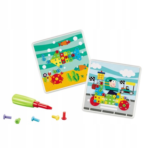 Zestaw zawiera aż 116 elementów: śruby w 5 kolorach, wkrętak i podkładki w 4 różnych kształtach i rozmiarach, 8 obrazków.