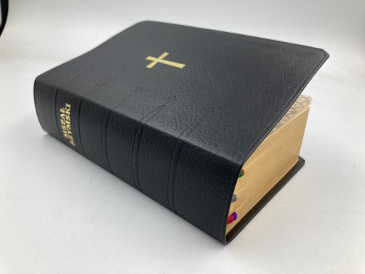 Dzieło występuje także w wersji oprawy wykonanej ze skóry z zamkiem – to bardzo funkcjonalne rozwiązanie, za którego sprawą strony naszego Mszału pozostaną nienaruszone w czasie podróży. Tego typu okładka nie dość, że stanowi swoisty futerał, to dodatkowo rewelacyjnie się prezentuje – poza złoceniami, upiększono ją także ciekawym tłoczeniem. Tak samo, jak w przypadku pierwszej wersji Mszał posiada pozłacane brzegi oraz sześć tasiemek.