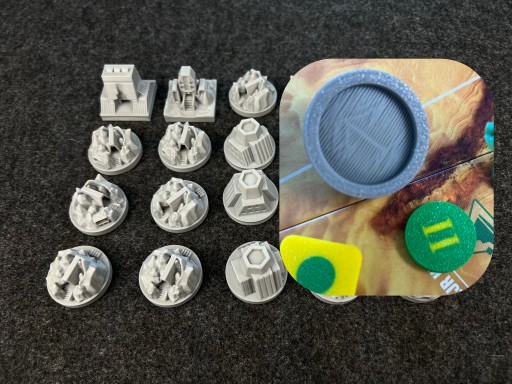 Na sprzedaż plastikowe budynki, zamienniki żetonów i góry do gry planszowej Dune Wojna o Arrakis, które zostały wykonane w technologii druku 3d.