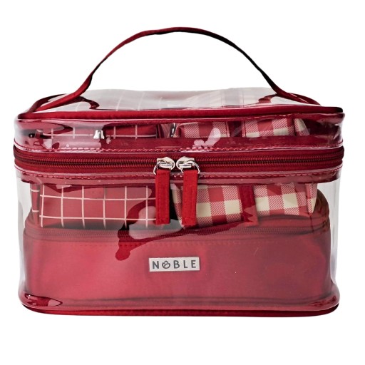 Ten elegancki, przezroczysty kuferek na kosmetyki to główna część wyjątkowego zestawu, który pomieści trzy dodatkowe organizery. Wykonany z transparentnego materiału, idealnie nadaje się do przechowywania kosmetyków na basenie, jak i podczas podróży samolotem. Dzięki bordowej oprawie, kosmetyczka prezentuje się stylowo i nowocześnie. Możesz w niej przechowywać wszystkie trzy kosmetyczki z zestawu, lub używać jej oddzielnie - świetnie sprawdzi się do mokrych rzeczy. To niezbędny dodatek dla każdej kobiety, która ceni sobie wygodę i funkcjonalność w podróży.
