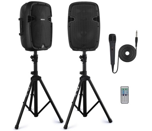 5 WEJŚĆ: Wyposażony w czytnik USB i kart SD, dzięki czemu może pełnić funkcję odtwarzacza MP3. Posiada wejście AUX (3,5 mm), wejście SpeakOn 1/4 cala oraz wejście XLR na mikrofon, idealne do karaoke. Zawiera uchwyt na statyw (35 mm) oraz 2 statywy, pilot, mikrofon i kabel zasilający.