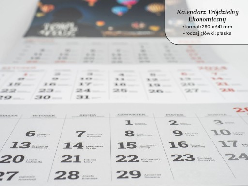 Kalendarz składa się z główki płaskiej o wymiarach 290 x 210 mm, na której znajdzie się Twoja unikatowa szata graficzna, i kalendarium o formacie 290 x 431 mm. Ten kalendarz będzie niezwykłą ozdobą Twojej ściany, przyciągając uwagę każdego spojrzenia.