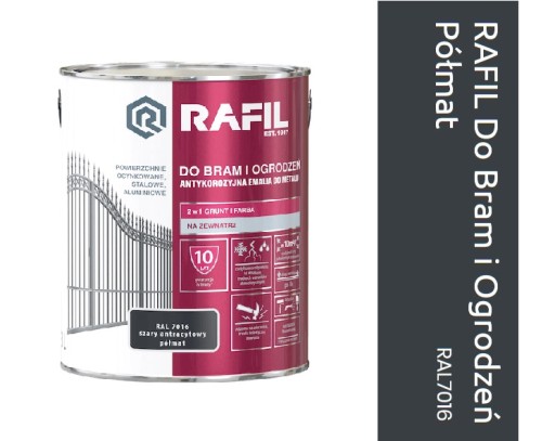 Antykorozyjna Emalia RAFIL DO BRAM I OGRODZEŃ przeznaczona jest do ochronno-dekoracyjnego malowania powierzchni metalowych: stalowych, ocynkowanych i aluminiowych eksploatowanych na zewnątrz pomieszczeń. Tworzy trwałą i elastyczną powłokę odporną na uderzenia.